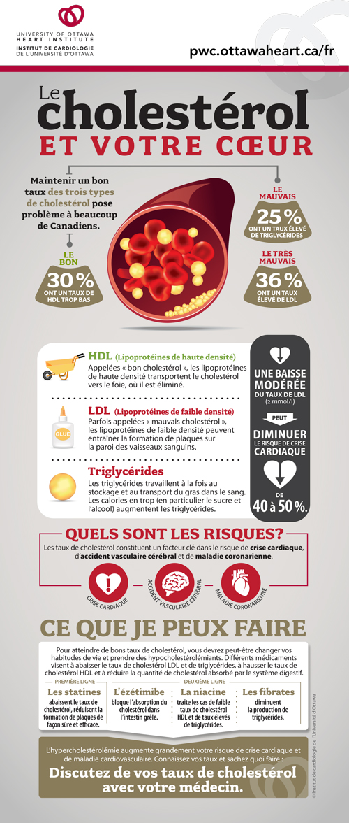 Le cholestérol est une substance que le corps produit et qui ressemble à du gras. Des taux élevés de cholestérol ou de triglycérides (un type de gras ou lipide apparenté) dans le sang sont un important facteur de risque de maladie coronarienne. Et c’est tout particulièrement vrai pour les personnes qui ont d’autres facteurs de risque de maladie du cœur. C’est par une analyse sanguine que l’on mesure le taux de cholestérol. Les personnes qui ont un taux élevé de cholestérol sont souvent traitées par une combinaison de médicaments et de changements à leur mode de vie. En traitant votre hypercholestérolémie, vous réduisez grandement votre risque de maladie du cœur et d’accident vasculaire cérébral.