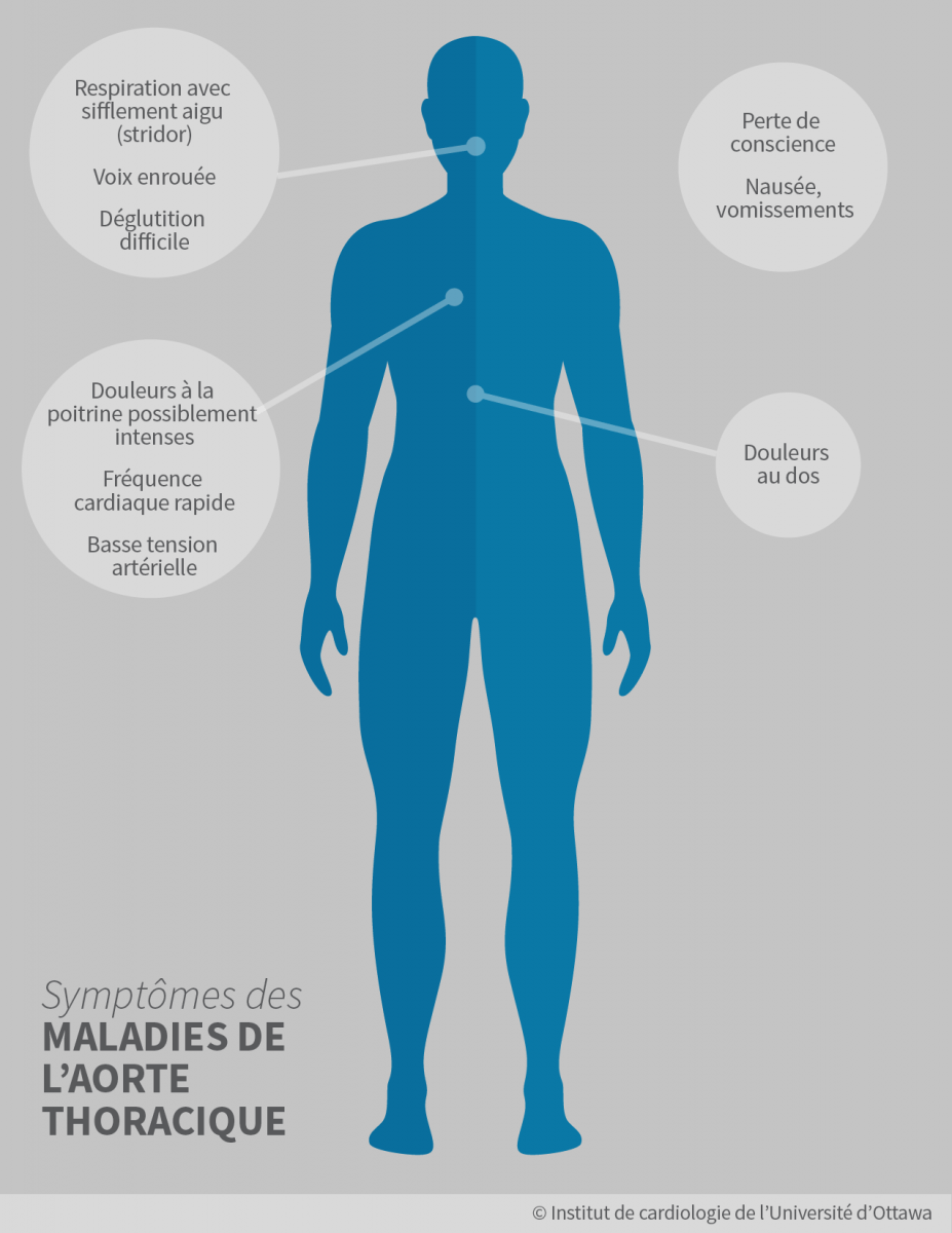 Généralement, les patients atteints d’une maladie aortique ne présentent pas de symptômes et ne sont par conséquent pas conscients des changements qui surviennent dans leur aorte. Dans bien des cas, c’est à l’occasion d’un test d’imagerie (radiographie thoracique, tomodensitométrie ou échocardiographie) réalisé pour une tout autre raison que le diagnostic est posé.