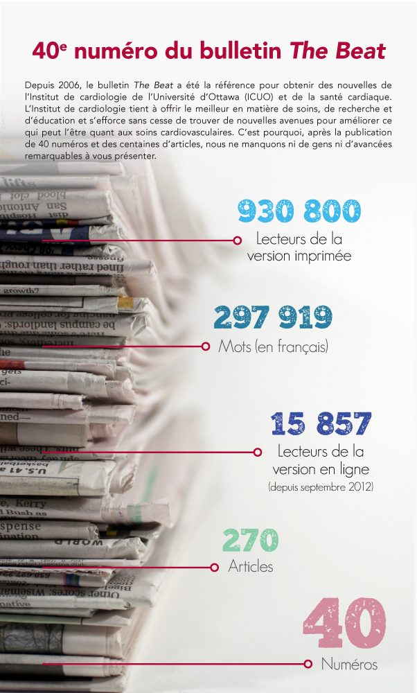 Depuis 2006, le bulletin The Beat a été la référence pour obtenir des nouvelles de l’Institut de cardiologie de l’Université d’Ottawa (ICUO) et de la santé cardiaque. L’Institut de cardiologie tient à offrir le meilleur en matière de soins, de recherche et d’éducation et s’efforce sans cesse de trouver de nouvelles avenues pour améliorer ce qui peut l’être quant aux soins cardiovasculaires. C’est pourquoi, après la publication de 40 numéros et des centaines d’articles, nous ne manquons ni de gens ni d’avancées remarquables à vous présenter.