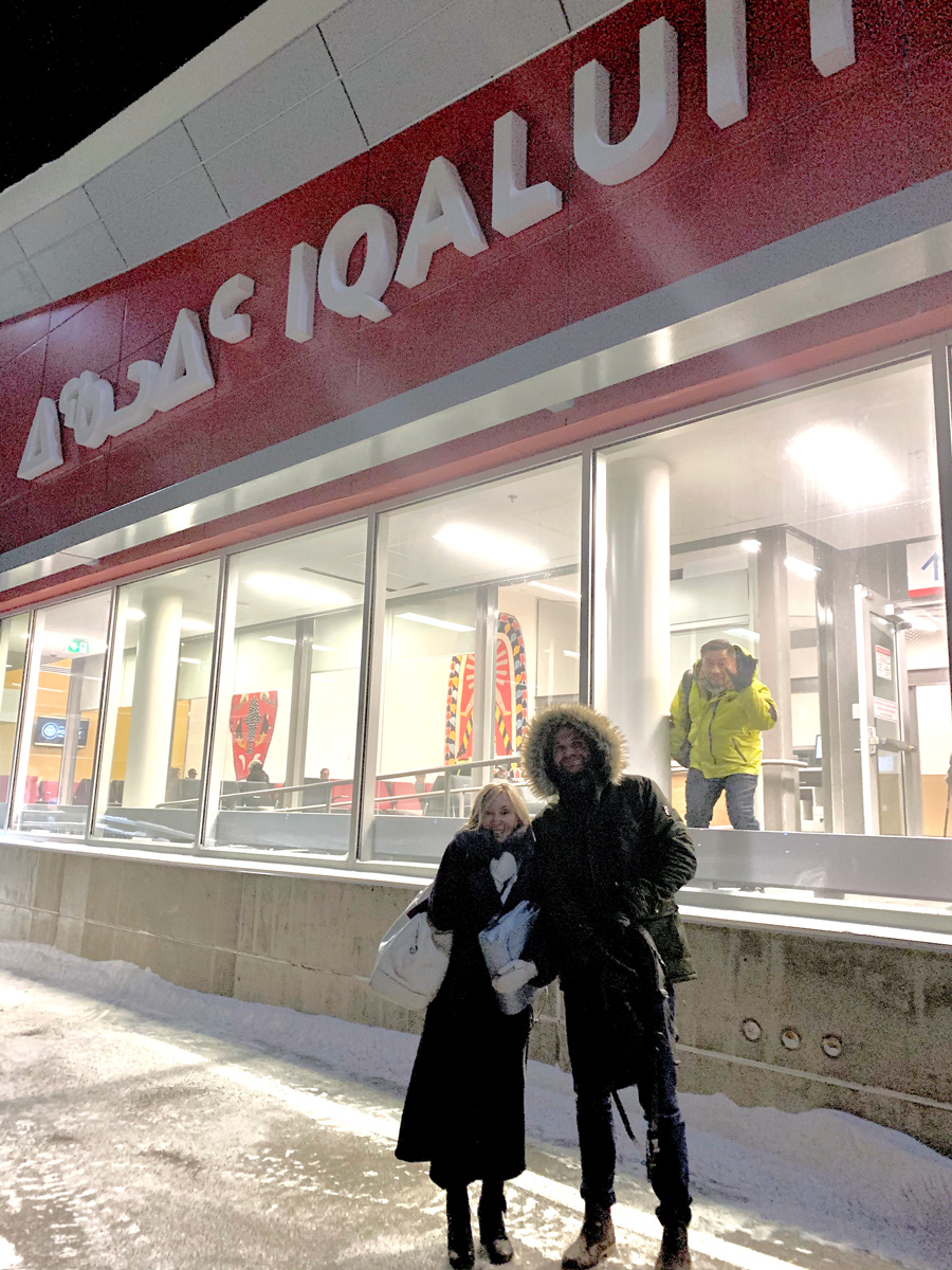 La Dre Carole Dennie (à gauche) et Mark Hoogkamp, coordonnateur principal des services cliniques de l’ICUO (au centre), à leur arrivée à l’aéroport d’Iqaluit, le 21 janvier 2020. À l’arrière-plan se trouve le Dr Jose Aquino, radiologue à L’Hôpital d’Ottawa.