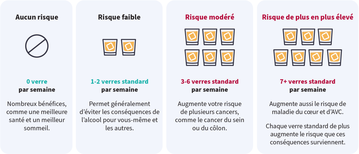 Le rapport comprend les nouvelles lignes directrices canadiennes sur la consommation d’alcool, qui recommandent de ne pas dépasser deux verres par semaine pour maintenir un risque faible ou nul de sept types de cancers, d’invalidité à court terme, de blessures, de maladie du cœur et d’AVC.