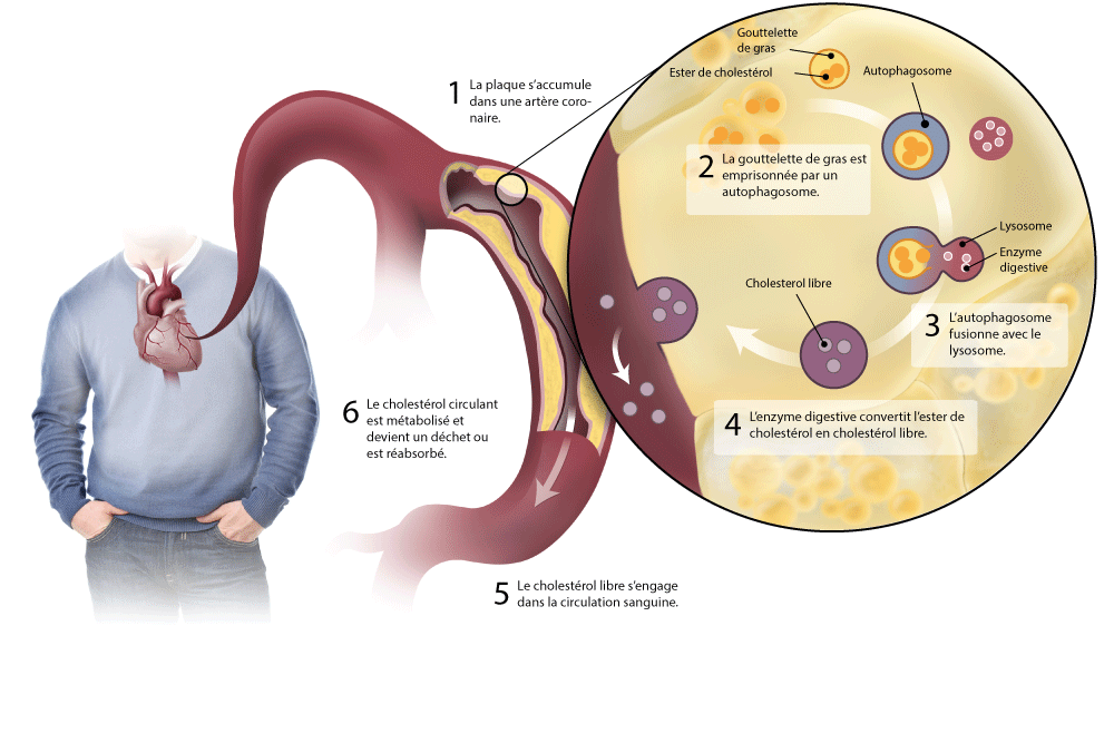 La recherche de l’Institut de cardiologie a montré que l’autophagie pouvait isoler et digérer le cholestérol accumulé sur les parois des artères. « Ce processus facilite l’élimination du cholestérol et offre une cible entièrement nouvelle pour contrer l’athérosclérose, principale cause de crises cardiaques et d’accidents vasculaires cérébraux », précise M. Marcel.