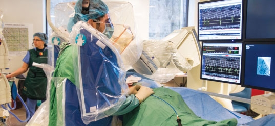 L’équipe de l’Institut de cardiologie pratique maintenant toute une panoplie d’interventions complexes qui ne sont offertes que dans quelques établissements au Canada, comme l’ablation de fibrillation auriculaire, où le cathéter doit traverser délicatement le septum (la cloison entre les cavités du cœur), et l’ablation de tachycardie ventriculaire qui pose des problèmes d’accès tout aussi complexes chez des patients souvent très malades.
