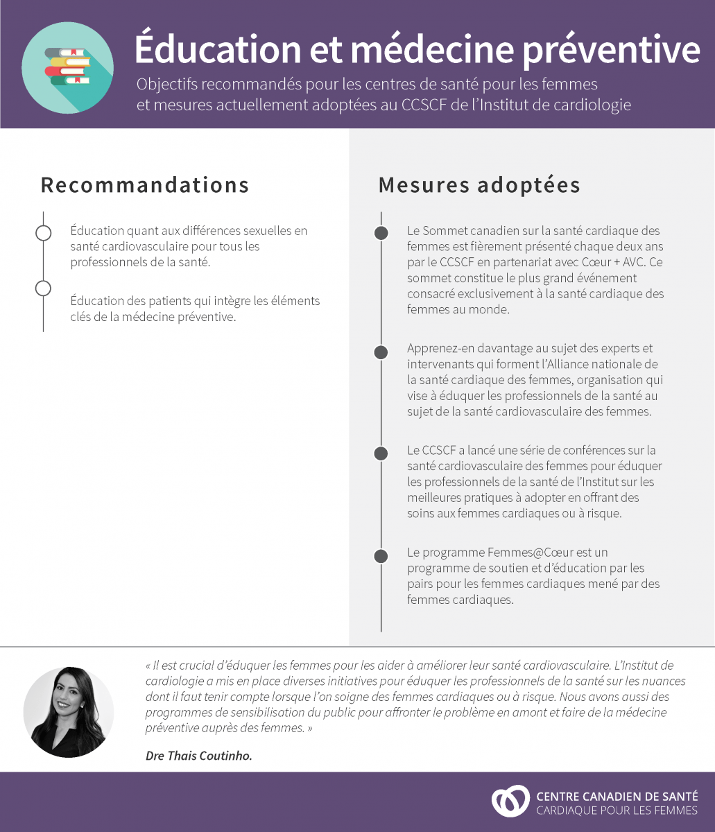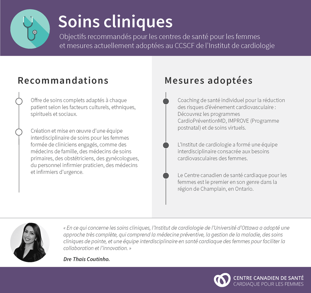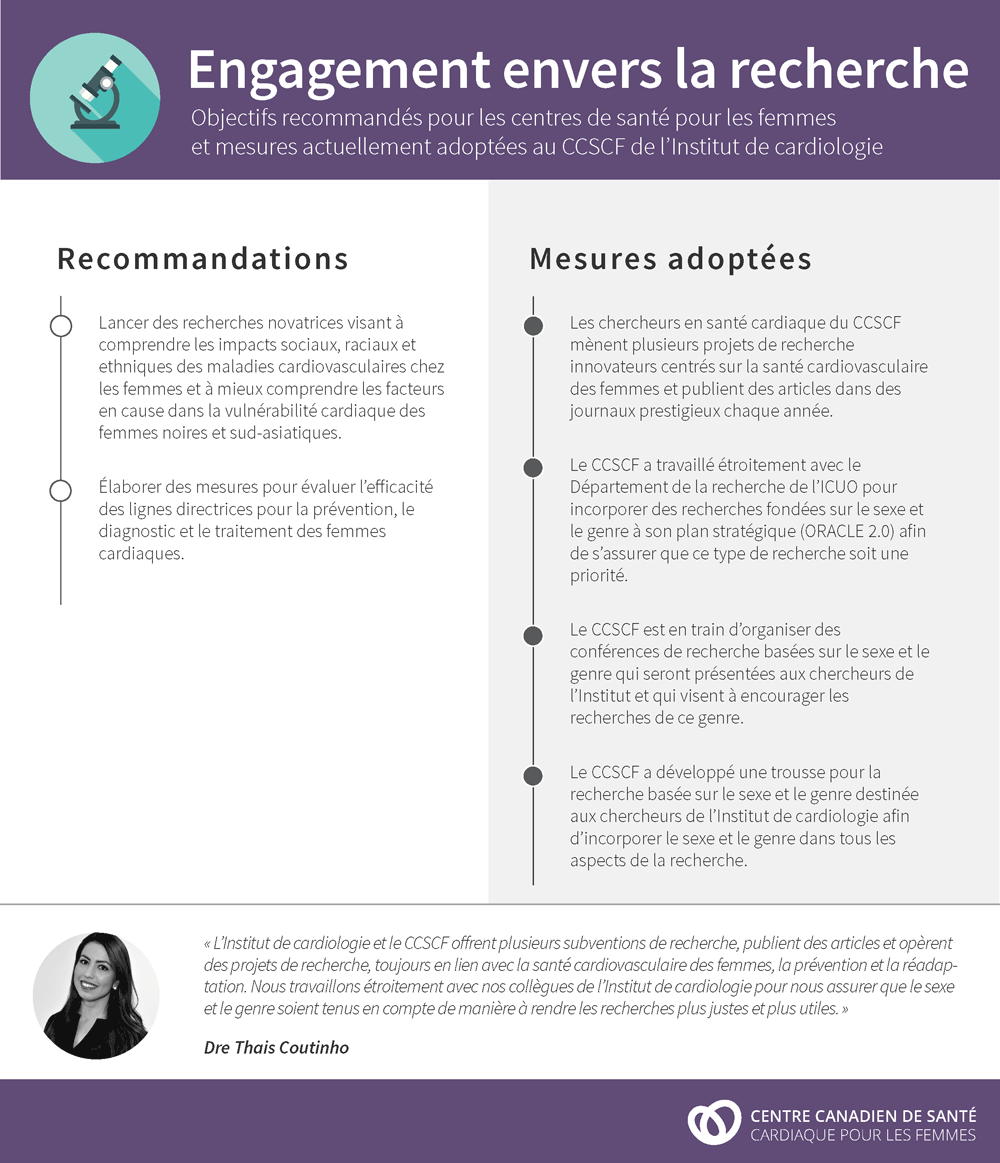 La Dre Thais Coutinho, chef de la Division de prévention et de réadaptation cardiaque à l’Institut de cardiologie de l’Université d’Ottawa (ICUO) et présidente du Centre canadien de santé cardiaque pour les femmes (CCSCF), se réjouit que la plupart des stratégies jugées essentielles dans ce livre blanc aient déjà été adoptées à l’Institut de cardiologie.