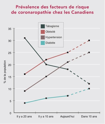 L’incidence de l’hypertension a grimpé de 8 p. 100 en nombre de Canadiens de plus de 20 ans qui ont déclaré souffrir d’hypertension entre 1994 et 2005. De plus en plus de Canadiens sont obèses, et la Fondation des maladies du cœur prédisait récemment que d’ici 2015, 20 à 30 p. 100 des hommes et 15 à 18 p. 100 des femmes seraient obèses.