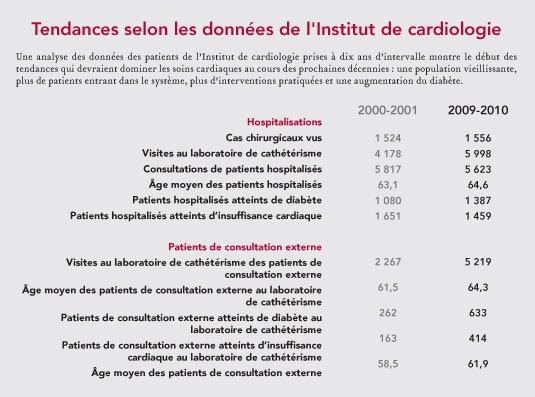 « Si tout se déroule comme prévu, la population vieillissante frappera comme un cyclone tout le système de santé, mais la situation sera particulièrement difficile dans le cas de la maladie cardiovasculaire », explique le Dr Lyall Higginson, ancien chef de la Division de cardiologie à l’Institut de cardiologie de l’Université d’Ottawa (ICUO) et président sortant de la Société canadienne de cardiologie (SCC). « Puisque nous traitons plus efficacement la maladie aiguë, les gens vivent plus longtemps, et ils vivent avec une multiplicité de maladies chroniques dont nous devons nous occuper par des moyens inédits et différents. »