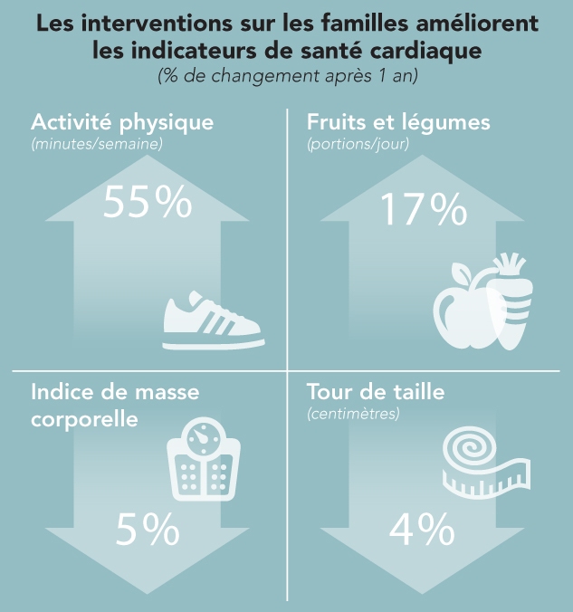 L’étude évaluait un programme d’intervention qui incluait une évaluation du risque et une rétroaction, 17 séances de consultation sur une période de 12 mois, des scénarios normalisés pour interagir avec les membres des familles individuellement afin d’assurer une cohérence, et des rapports aux médecins de soins primaires. Des données ont été recueillies sur divers indicateurs de santé, notamment les principaux critères d’efficacité du cholestérol, de l’activité physique et de la consommation de fruits et légumes, au début de l’étude et après 3 et 12 mois.