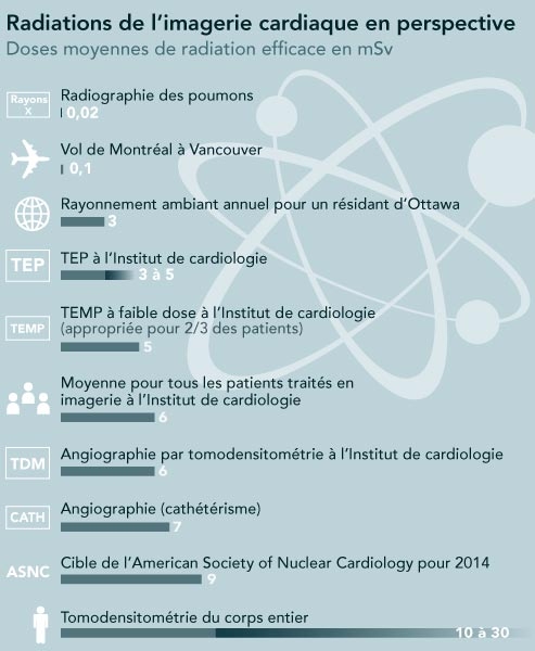 M. Wells souligne que la plupart des examens faits à l’Institut de cardiologie sont déjà sous cette marque, avec une moyenne tournant autour de 5 mSv. Aussi impressionnants que ces chiffres puissent paraître, il insiste pour dire que ce sont des cibles en mouvement, transformées par le progrès technologique et les perspectives scientifiques entourant le mode d’utilisation de la radiation en médecine.