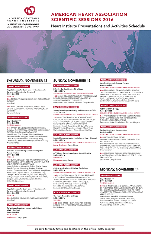 Les séances scientifiques de l’American Heart Association, la plus grande conférence cardiovasculaire au monde, auront lieu du 12 au 16 novembre à La Nouvelle-Orléans. L’Institut de cardiologie d’Ottawa y proposera 45 présentations sur divers sujets scientifiques et cliniques. Consultez notre programme pour en savoir plus.