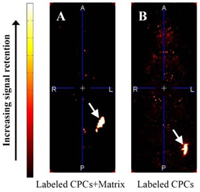 Small animal PET images showing better retention of transplanted cells when delivered to the tissue using a matrix