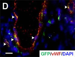 Transplanted cells (arrows) incorporating into the wall of a blood vessel.