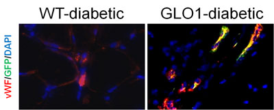 Vascular repair in the ischemic muscle of diabetic mice is superior when a toxic product called methylglyoxal is removed from the tissue (GLO1-diabetic). This is partly because more repair cells are recruited from the bone marrow (yellow).