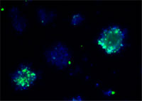 Clusters of CD34+ cells expressing integrin α5 (green) after culture on a collagen matrix