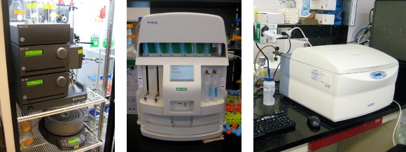 Left to right: AKTA Purifier FPLC (GE Healthcare), Profinia Protein Purification (Bio-Rad), Licor Odyssey Infrared Imager (Licor Biosciences)