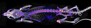 A mouse MDP (methylene diphosphonate) bone metabolism SPECT/CT study. This is used in nuclear medicine for several indications including the spread of cancer to the bones. The CT is shown in gray-scale while the SPECT bone metabolism data is shown in pseudo-colour where red/white indicates high metabolism and blue/black indicates low. There is no disease in this image.