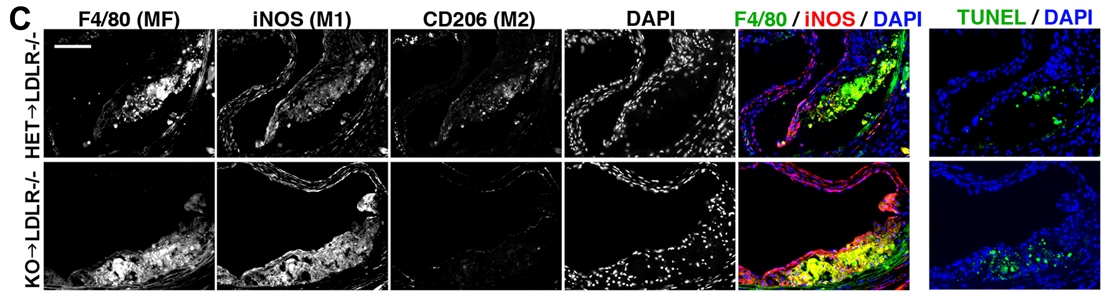 When the researchers knocked out IRF2BP2 in the macrophages of their mouse model, the cells produced markers of inflammation and were more likely to form foam cells. They then transplanted bone marrow from mice lacking IRF2BP2 into other mice susceptible to coronary artery disease. When these mice were fed a high-fat diet, the marrow cells produced inflamed macrophages and indicators of coronary artery disease worsened.