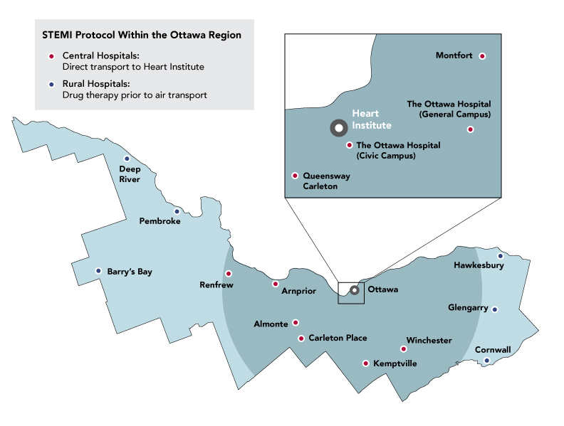 “Within the STEMI program, for every 100 patients that we treat, we save an additional five lives beyond those that we were saving before,” said Dr. Le May. “That has been a steady and sustained performance since the program was launched.” Now encompassing the entire Eastern Ontario region (see map), the STEMI program will celebrate its 10th anniversary this summer. Over those 10 years, the program has been directly responsible for saving an additional 200 to 250 lives.