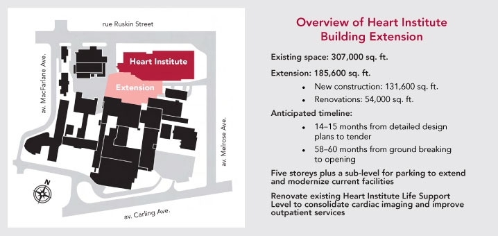 The master plan envisions a five-storey building tucked between the area now reserved for shipping/receiving and the Regional Cancer Centre at The Ottawa Hospital side of the campus. The extension plus a sub-level would extend and modernize current facilities, creating an entirely new area for cardiac surgery, catheterizations and electrophysiology. These critical procedures are currently carried out in the basement, the oldest part of the Heart Institute building.