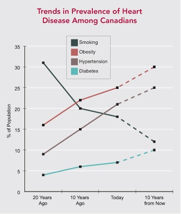 Between 1994 and 2005, the incidence of hypertension has jumped 8 per cent in the number of Canadians older than age 20 reporting high blood pressure. More and more Canadians are obese, with the Heart and Stroke Foundation recently predicting that by 2015, 20 to 30 per cent of men and 15 to 18 per cent of women will be obese.